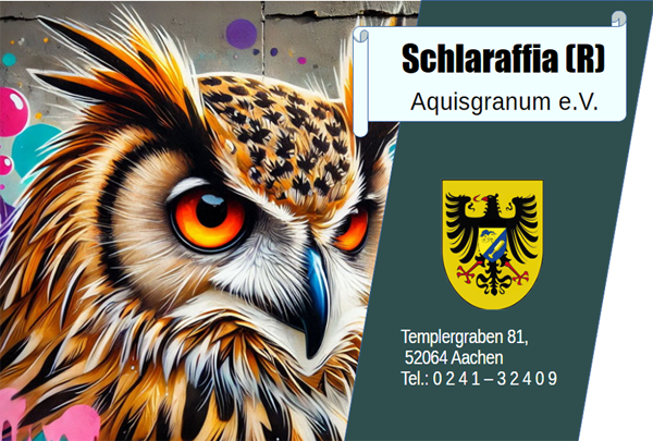 Kontakte zur Seite: Datenschutz-Hinweise Schlaraffia (R) Aquisgranum e.V. Templergraben 81, 52064 AachenRegistriert im Vereinsregister beim Amtsgericht AachenVereinsnummer: VR1156Vertretungsberechtigter Vorstand: [kantzler@aquisgranum.de]Telefon: 0 2 4 1 – 4 7 5 9 6 2 6Schlaraffia® und Allschlaraffia® sind eingetragene WortmarkenVerband Allschlaraffia® – Sitz BernWebmaster:Guido Männchen | [web@aquisgranum.de]